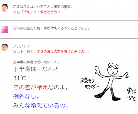 冷え=体内の温度が低い にさらにイコールがくっついて、つまり=体表温度がちょっとあがっただけで暑さを感じる、と言われた時(゚Д゚)ってなってちょっと呆然としました。