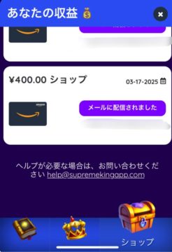 ポイ活案件としてのSupremeKingは、おおむね「インストール後◯日以内に(任意のゲームをプレイして)払い出しを行う」です。600円~1000円程度であることが多いです。